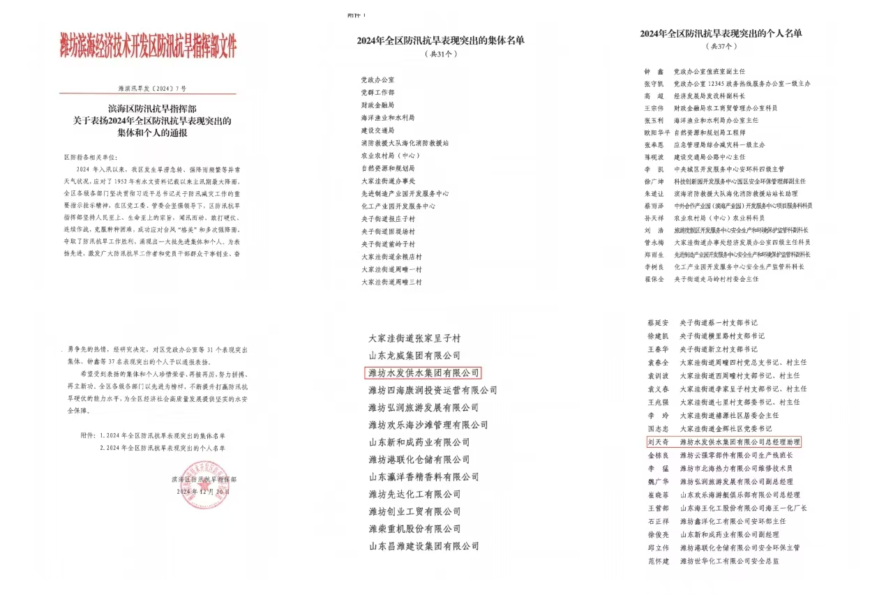 近日,濰坊市濱海區(qū)防汛抗旱指揮部下發(fā)《關(guān)于表揚(yáng)2024年全區(qū)防汛抗旱表現(xiàn)突出的集體和個(gè)人的通報(bào)》,濰坊水發(fā)供水集團(tuán)及公司員工劉天奇,分別榮獲防汛抗旱表現(xiàn)突出的集體和個(gè)人表彰。